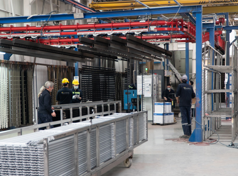 Unsere Pulverbeschichtungsanlage hat eine Kapazität von 8.700 Tonnen pro Jahr. Unsere Pulverbeschichtungsanlage ist ein Power-and-Free-Fördersystem und wird von einer SPS-Automatisierung gesteuert. Unsere Einrichtung verfügt über Qualicoat,- und Seaside-Zertifikate.